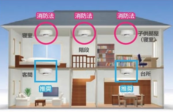 設置場所は基本的に、寝室と2階以上に寝室がある場合は階段に必要です。またお住まいの地域によっては台所にも義務付けしているところもあります。