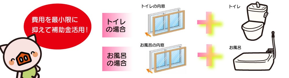 トイレ: 節水型トイレへの交換 + トイレの小窓に内窓を付ける。