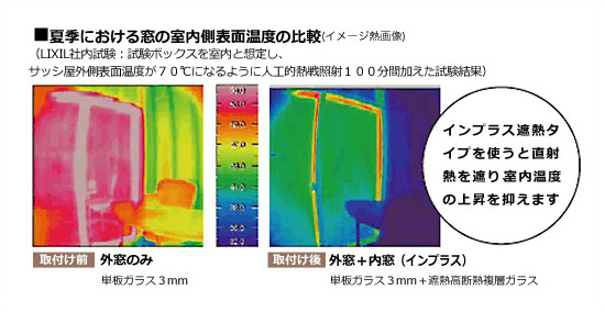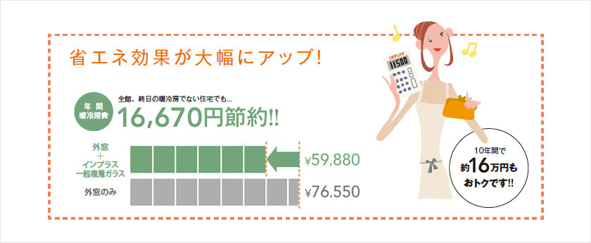 インプラスは樹脂製。樹脂はアルミに比べて熱伝導率が1/1000程度と、断熱効果に優れた素材です。さらに今ある窓との間に生まれる空気層が室内の熱を外に伝えにくくし、断熱効果を発揮します。外気温の影響を受けにくい快適な室内環境を実現します。