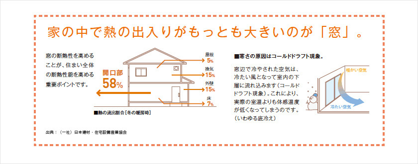 夏の冷房時に家全体に入ってくる熱のうち、窓やドアの開口部を通るものが70%以上。つまり、夏を涼しく快適にするためには、開口部の「遮熱」と「断熱」がとても重要です。
