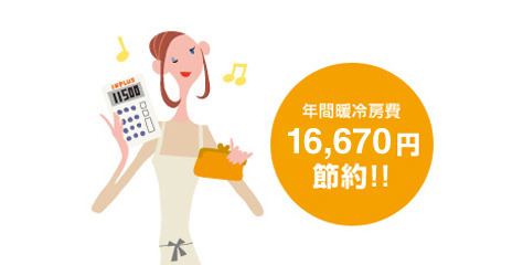 算出条件 シミュレーション地区: 東京 ●AE-Sim/Heatにより算出 ●2階建て/延べ床面積:120.07m2、開口率:〈4地域以南〉26.8% ●4人家族 ●エアコン 暖房:20℃、冷房:27℃・60% ●暖冷房運転:間欠運転 ●拡張アメダス気象データ2000年版を使用 ●住宅断熱仕様:昭和55年省エネルギー基準適合レベル ●居室の窓(9窓)にインプラスを設置 ●居室の窓(9窓)にレースカーテンを併用 ●電気料金:27円/kWh、CO2排出係数:0.43kg-CO2/kWh ●スギの木のCO2吸収量:14kg-CO2/本