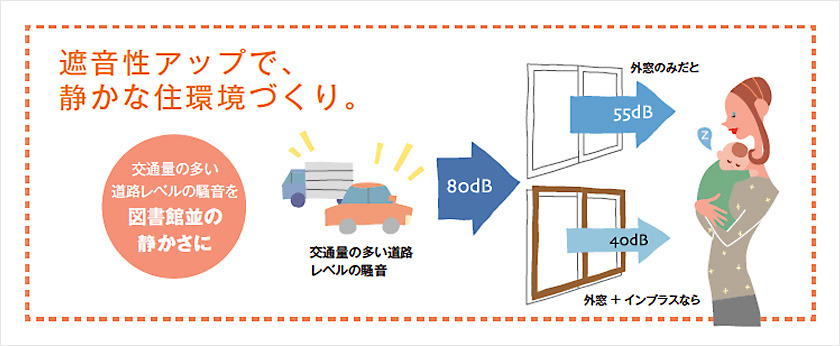インプラスを取り付ける事で、既存の窓との間に空気層が生まれます。これが壁の役割となり、断熱効果や防音効果を生み出します。