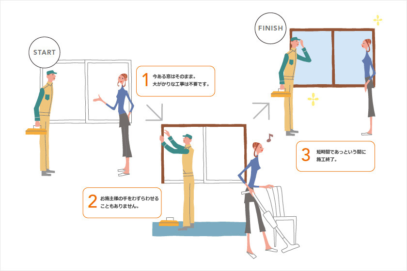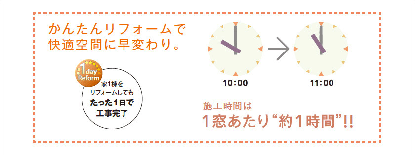 工事にかかる時間は、1窓あたり約1時間。お施主様の手をわずらわせることなく、お手軽にリフォームすることができます。