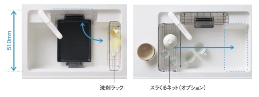 Point 1 洗剤ラックが自由に動かせ広びろ使えるシンク
