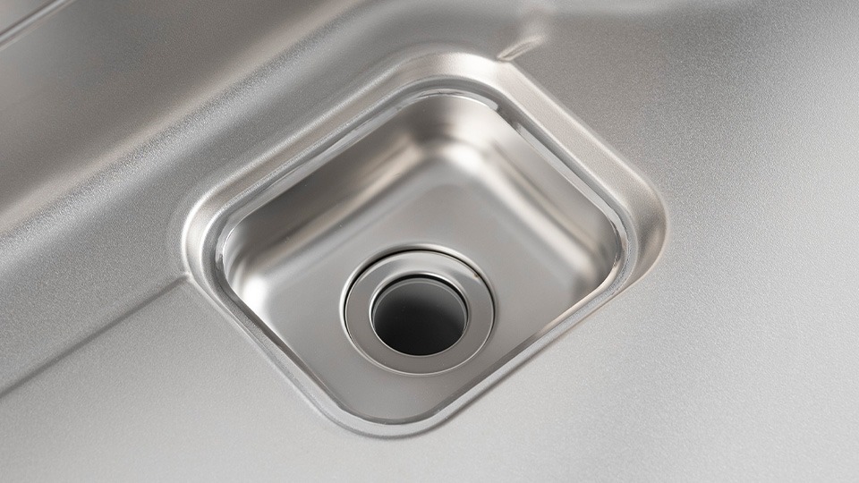 シンクと浅型排水口がなんと 一体成型。永遠に継ぎ目がなし!