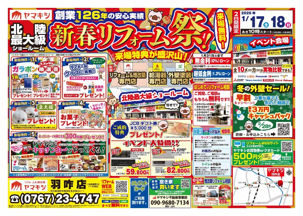★来場特典盛沢山!! ガラガラ抽選はずれなし!/リフォームクイズで盛り上がろう!!/豆大福も召し上がれ♪ ★目玉商品あり!! IHクッキングヒーターがイベント2日間のみ大特価! ★キッチンカーがやってくる♪ 1/10(土)➡ハートの大判焼きがかわいい!ドリームさん♪ 1/11(日)➡こだわりの能登の食材を使用!宮miyaさん♪ アンケートにご記入でキッチンカーで利用できる300円券プレゼント!