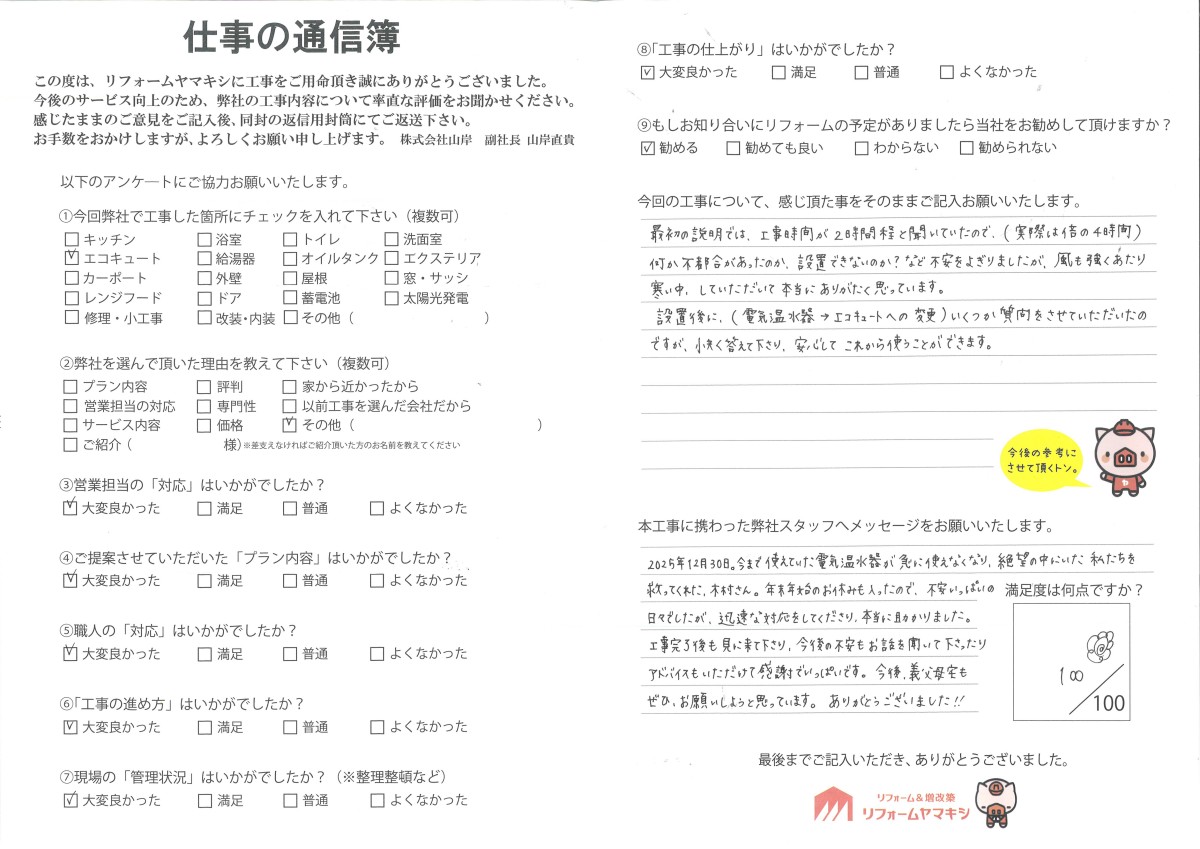 年末、急にお湯が使えなくなったところを救っていただきました。