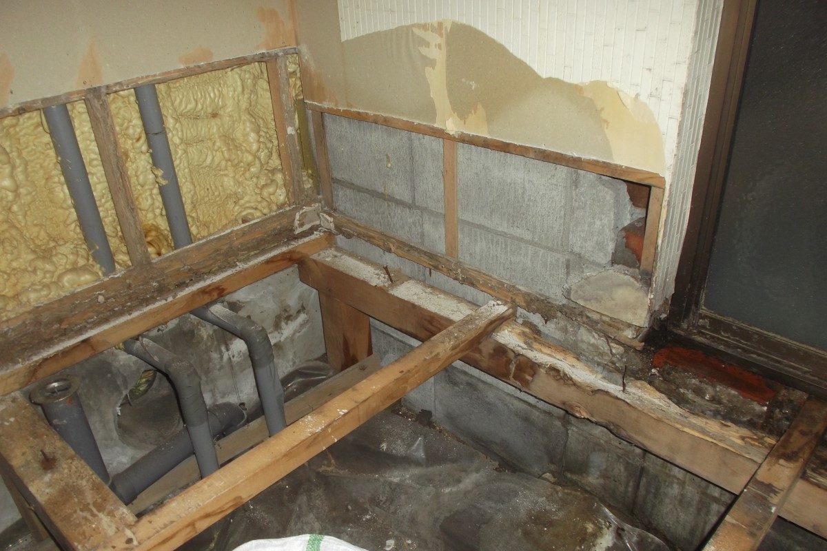 お風呂の床の修繕工事のご依頼です。既存床が湿度によりカビ臭く、白蟻の疑いもありました。床の解体後、幸い白蟻らしき物は確認できませんでしたが、食べられた跡はありましたので、防腐材を塗り新しく大引き、タルキにて施工してキレイに内装も仕上がりました。点検口はお客様のご希望で、秋ぐらいに本格的に白蟻駆除の薬を撒きたいとの事なので、取付いたしました。