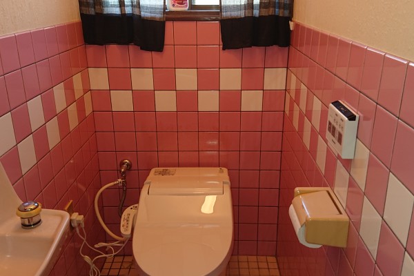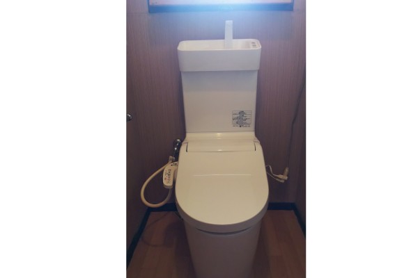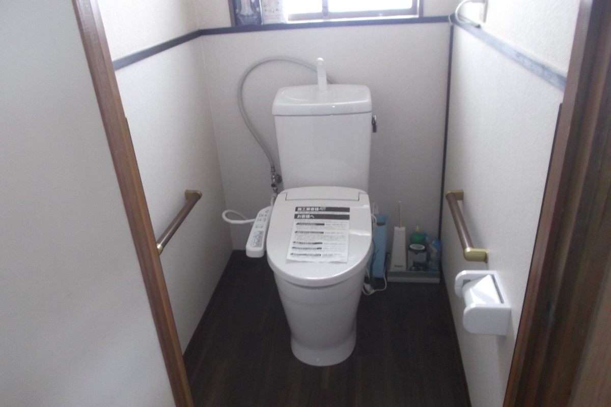 ウォシュレットの故障でこの際トイレリフォーム工事をお願いされました。内装工事はタイル面が冷たいので、下地材を張り、サンゲツ製のクロスで施工致しました。K様工事ご依頼誠にありがとうございます。