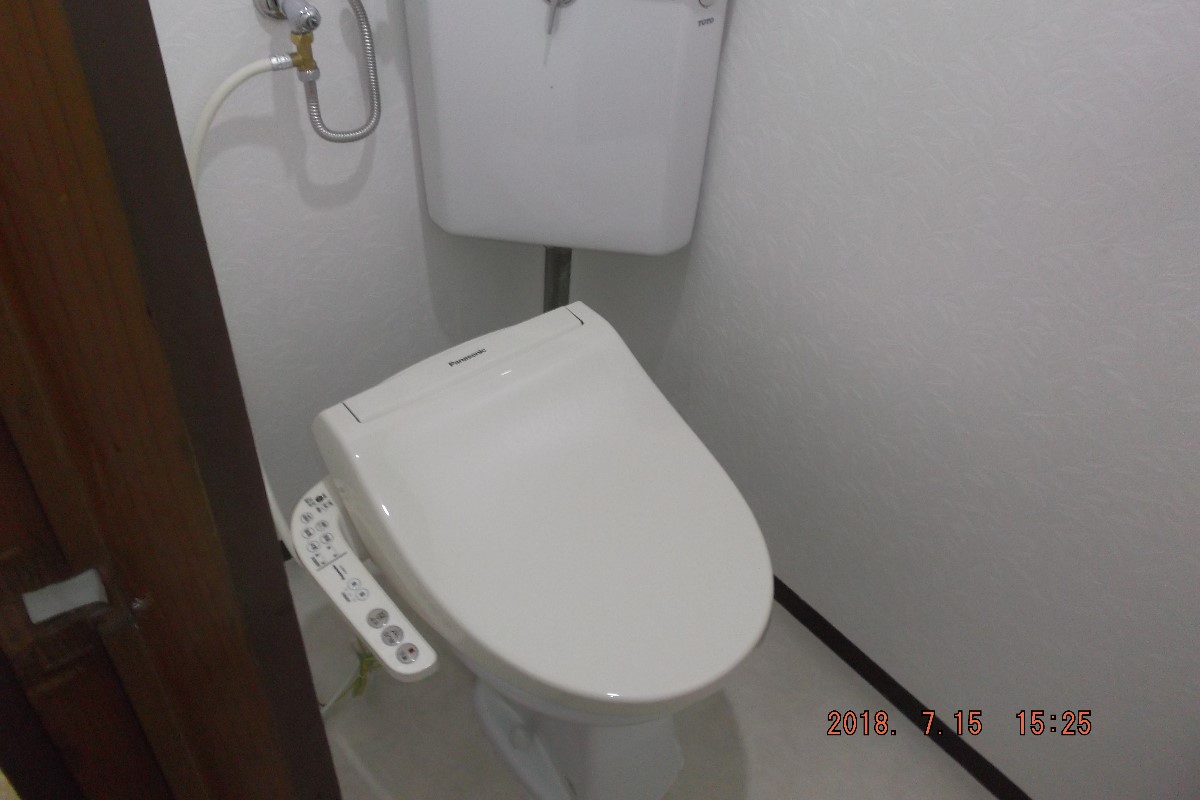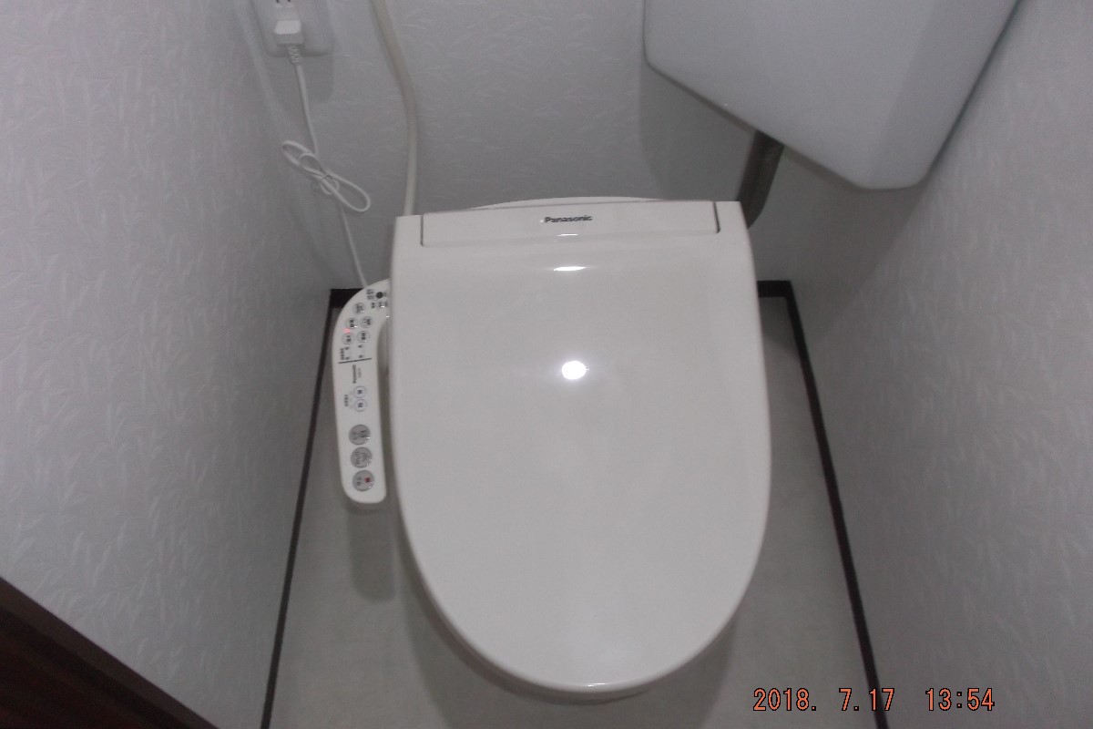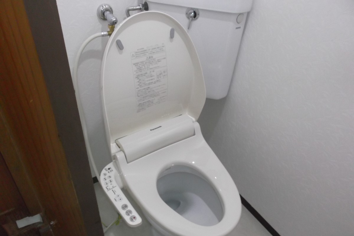 | サンゲツ製/壁クロス張工事/床・サンゲツ製クッションフロア上張工事/トイレ便座交換工事(Panasonic・CH931SPF) |