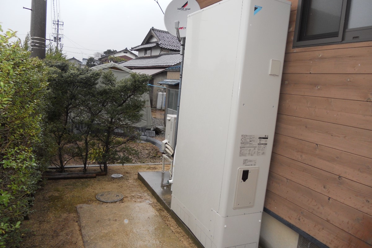 給湯器の設置場所、犬走りが狭く他に手段がない為ダイキンの薄型460ℓフルオートタイプの設置になりました。以前よりオール電化を考えていらしたので各社の見積もりパターンを提出後決定、施工となっています。