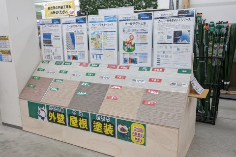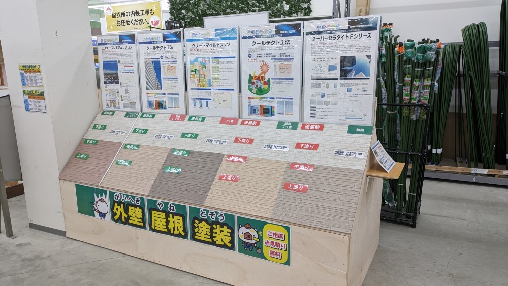外壁塗装コーナーにて、塗料の種類や色合いなどをご覧いただけます。スタッフが、皆様の現状に合わせた最適なプランをご提案させていただきますのでお気軽にご相談ください!