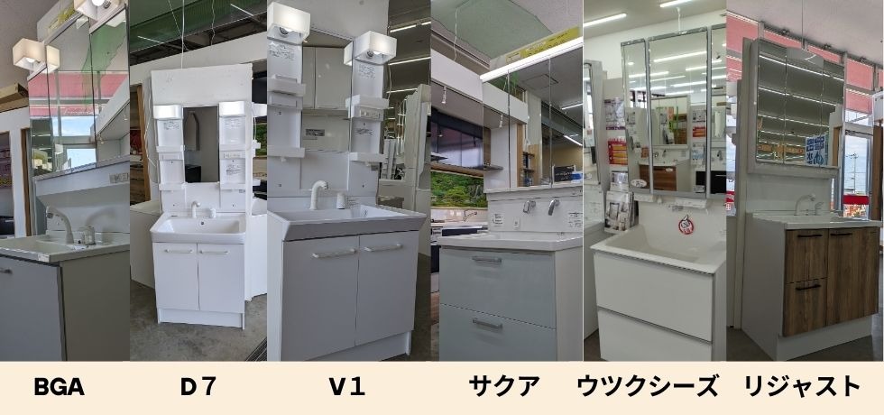 洗面化粧台は6台展示中です!実際に見て・触って、実際の収納や使い勝手などを ご確認いただけます。
