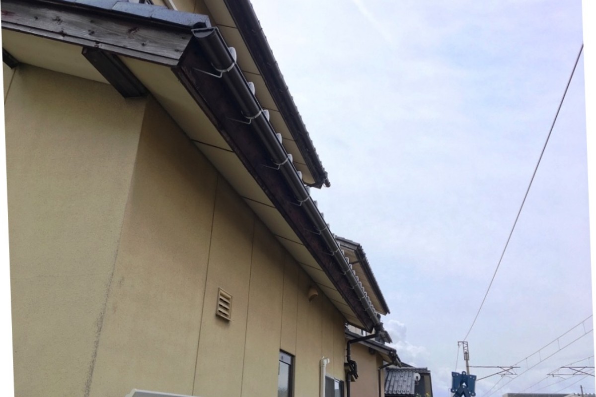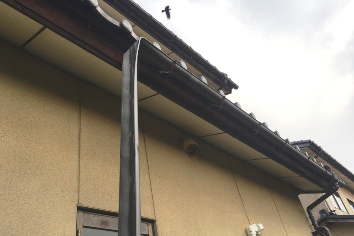 暴風で雨樋が外れたとの連絡があり確認したところ横樋が金具から外れいる状態でした。