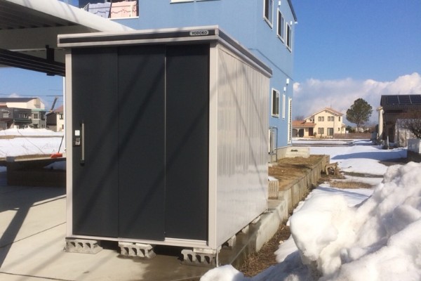 お客様より車庫の中に既に物置を設置してある隣に置いて欲しいと要望でしたので、扉の開閉に干渉しない様に注意しながら組立てをしました。