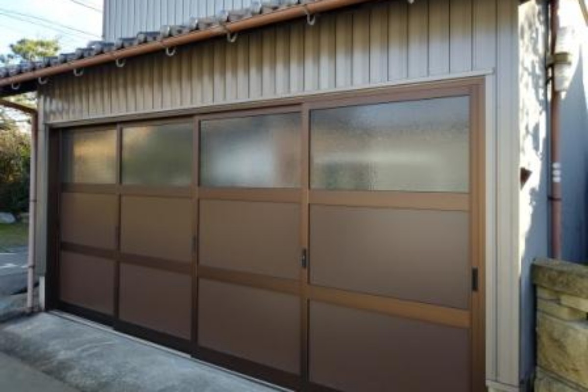 既存のロール式のシャッターでは開閉の時に重く、また雪が積もるとさらに開閉が困難になるので引き戸にして欲しいと、ご要望がありましたので、4枚戸の引き戸を提案させて頂きました。