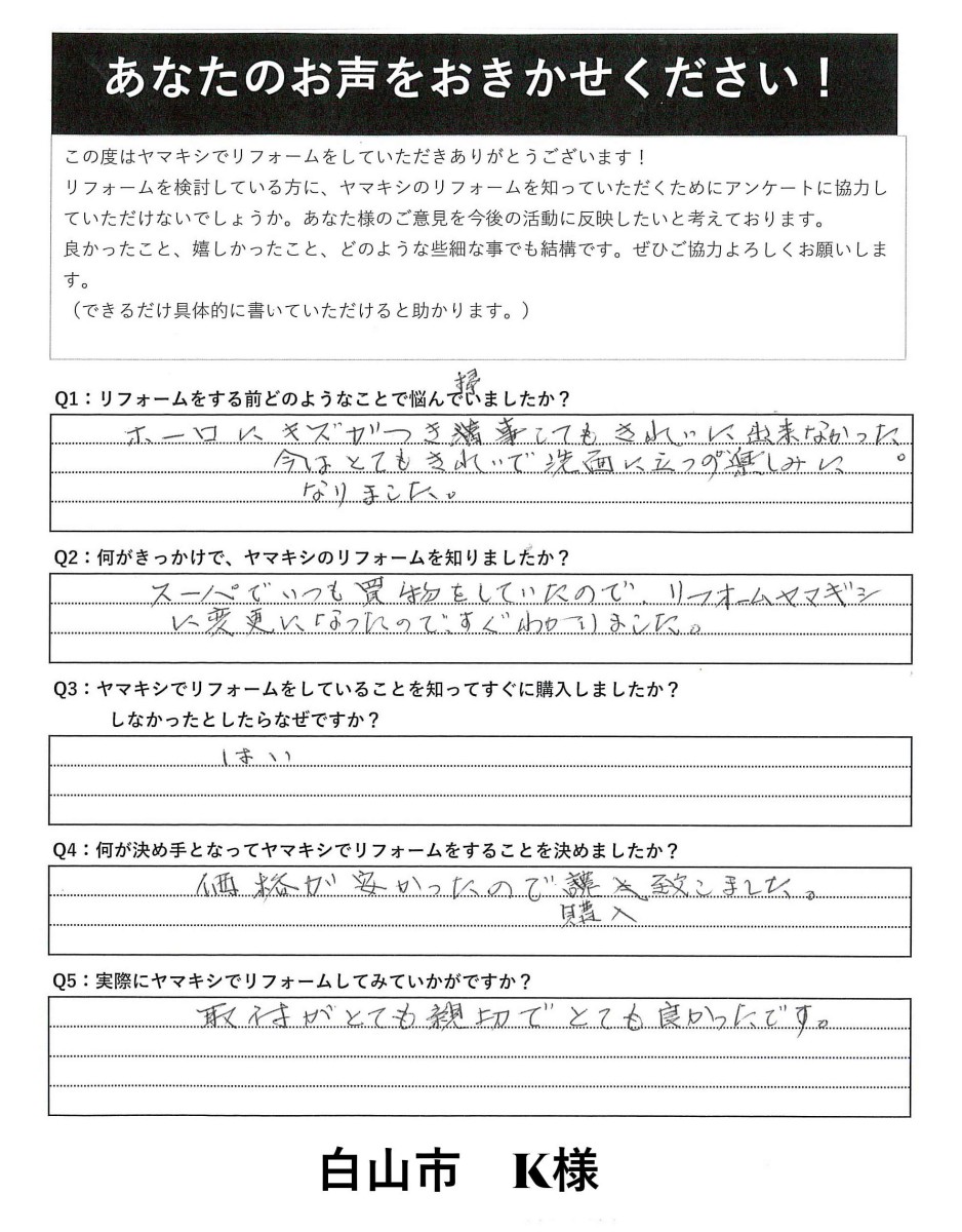 お客様の声 - 洗面化粧台リフォーム | リフォームヤマキシ