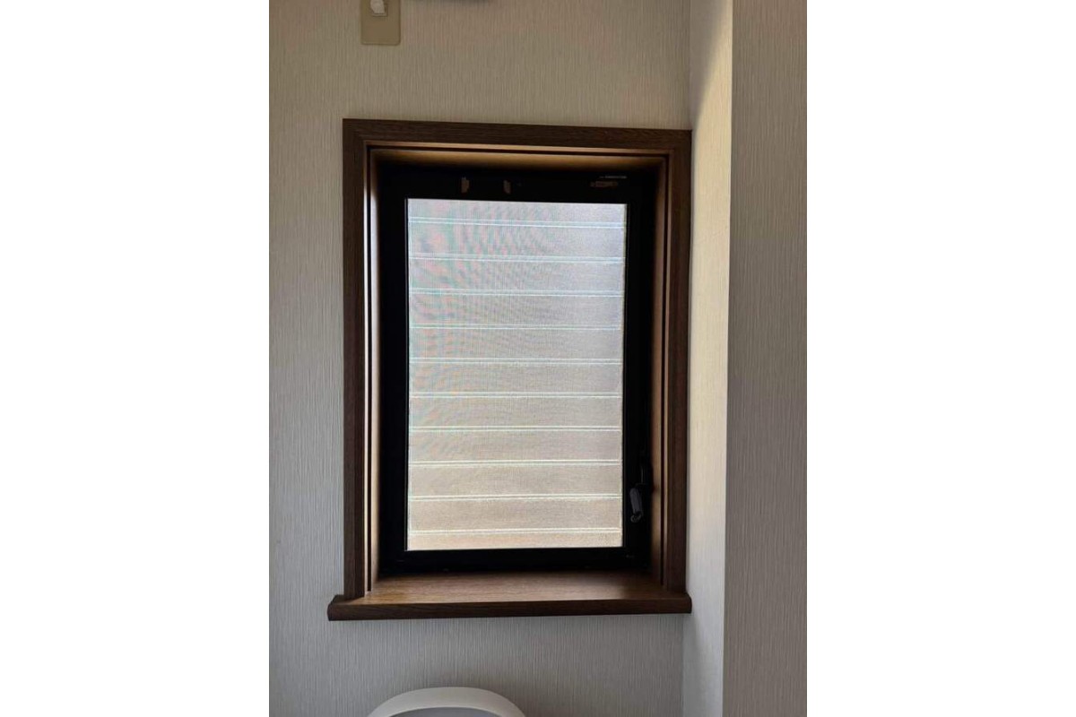 サイズ的には引違窓を導入出来ないので縦辷り窓にしました。こちらも施錠の際はハンドルを回すタイプですが、ルーバーと比べると強固ですので断熱抜群です。また、ロール式網戸がついていますので換気もできます。
