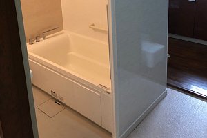 お客様の前の風呂よりもやや大きくそのままでは設置できませんでしたが、お客様の要望で壁まで解体し隣の部屋も利用し取り付けました。