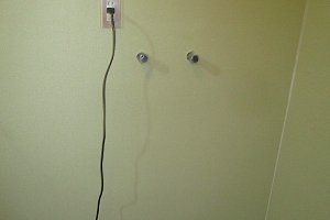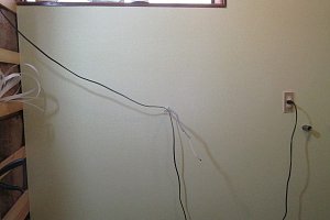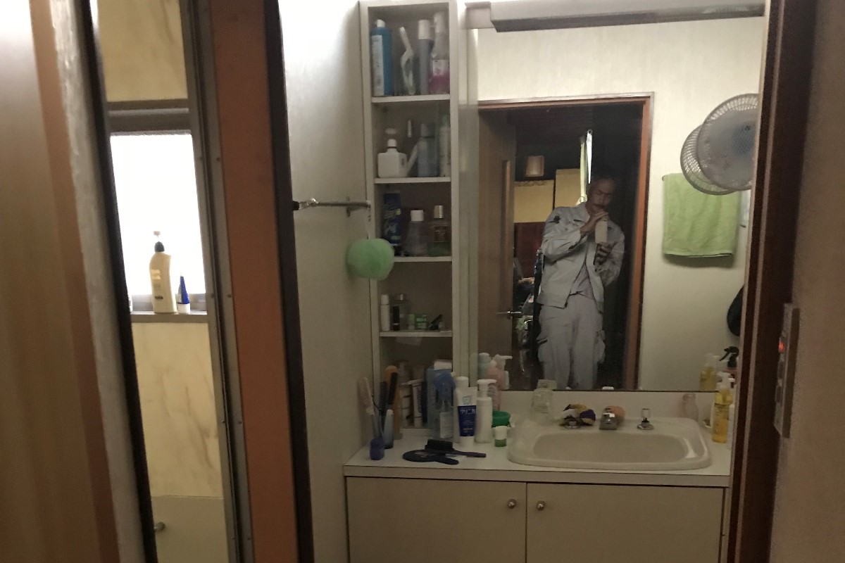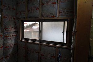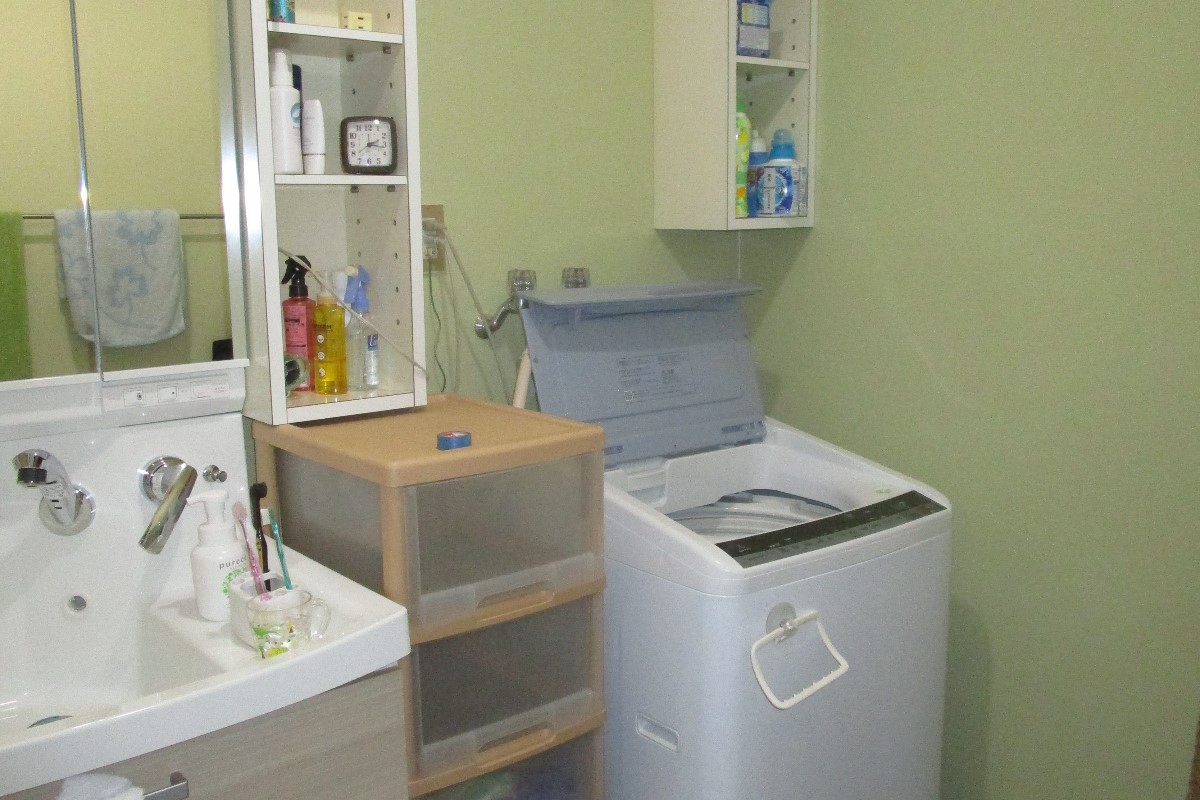 現調を行い洗面化粧室の壁を確認すると5.5㎜のベニヤ仕上げであったのでドア枠・窓枠のチリを確認し9.5㎜のボードが打てると判断しお客様に断熱効果UPを話して工事することとなる。洗面脱衣室の収納力UPの要望をいただき洗面化粧台周りの図面をお客様前で書きながら提案し了解を得る。