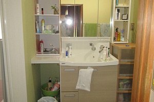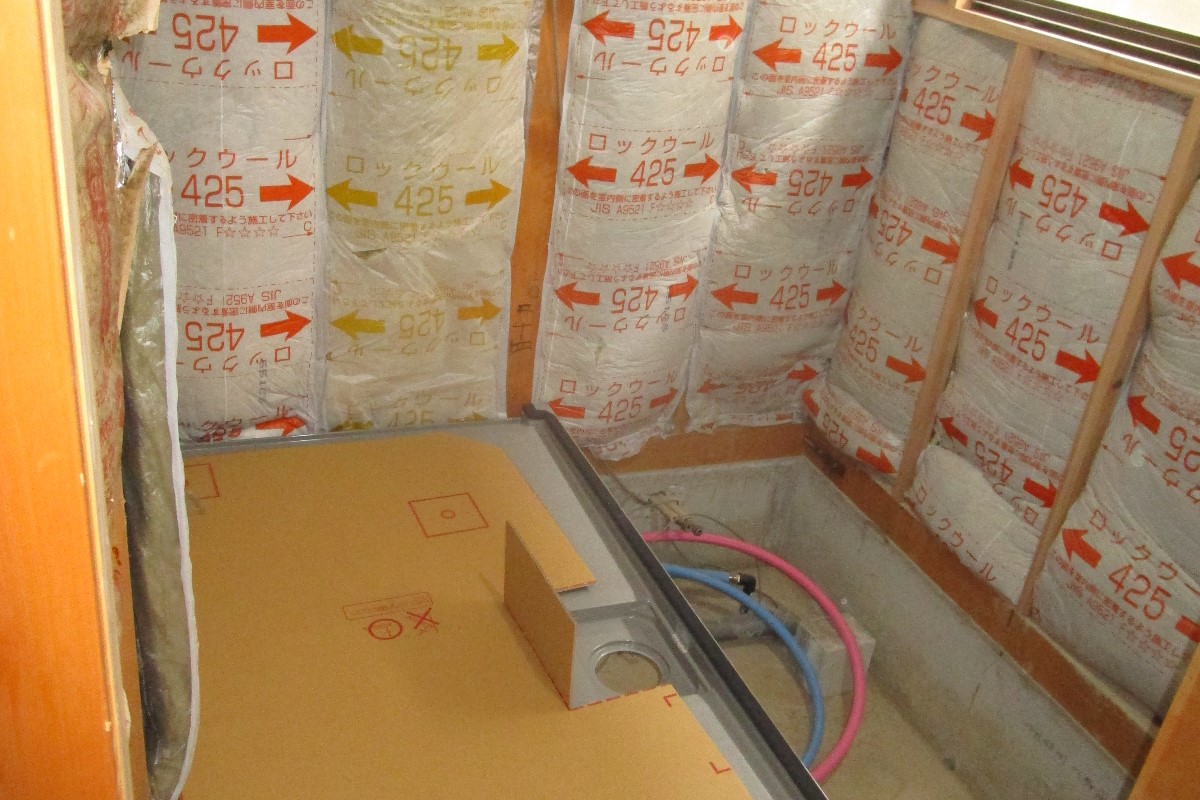 浴室は古くないけど段差があり保温もよくないとの問い合わせがあり現調行い確認するも、浴室設置に難点があり「解体後に再度調査して施工いたしましょ」と了解をえて解体し木材の調整を行い浴室と脱衣室の段差をなくす。保温の効果を良くするため壁断熱を施工し直し浴室は、クリナップのユアシスを進める。洗面脱衣室の洗面化粧台入れ替えも受け、お客様から以前のように収納も欲しいので検討してほしいとの事で、図面にて施工方法を話しし工事。