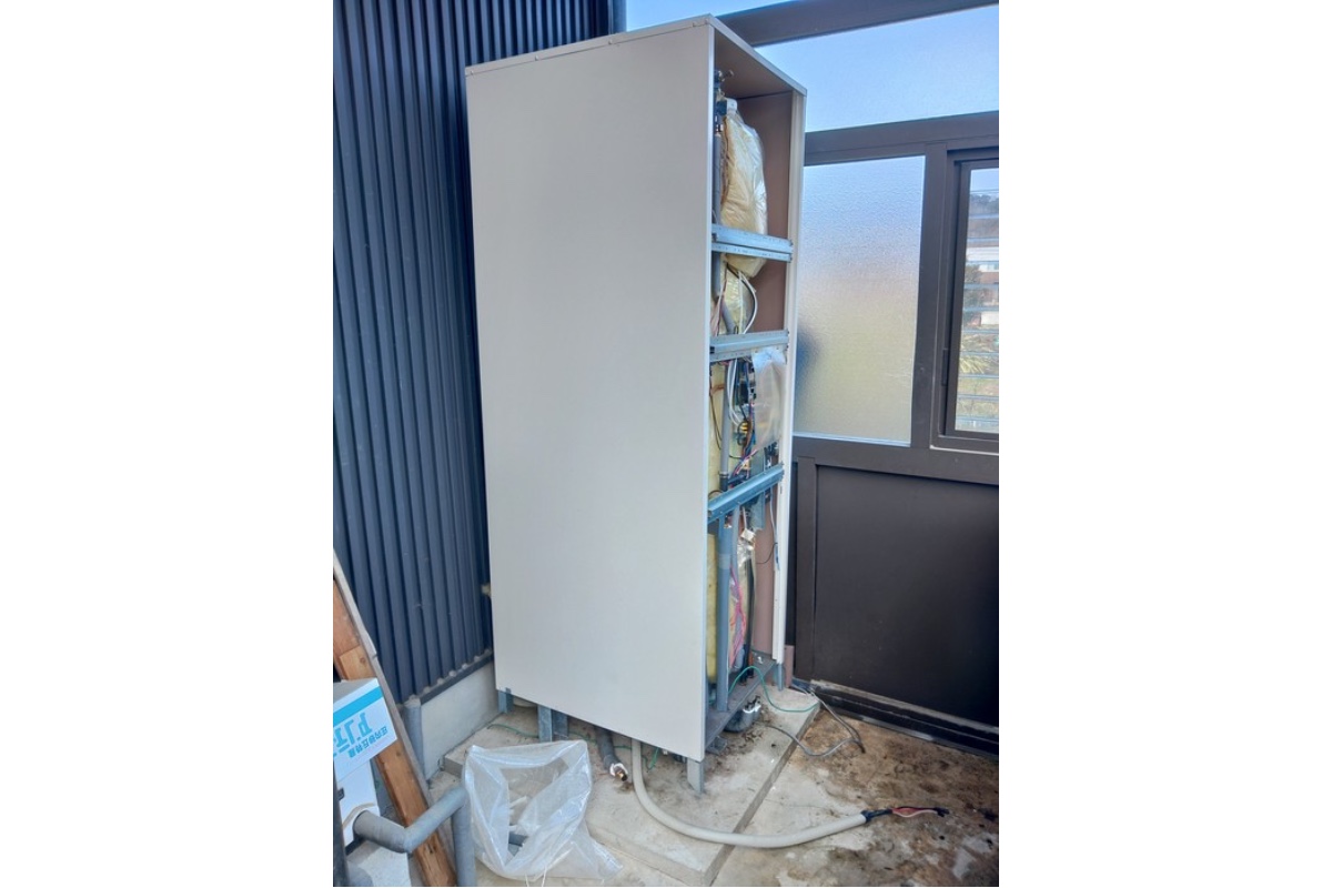460Lをお勧めしまして、今回工事につきましては、囲いの中に電気温水器がありましたので、囲いに穴を開けてヒートポンプの配管を通しました。