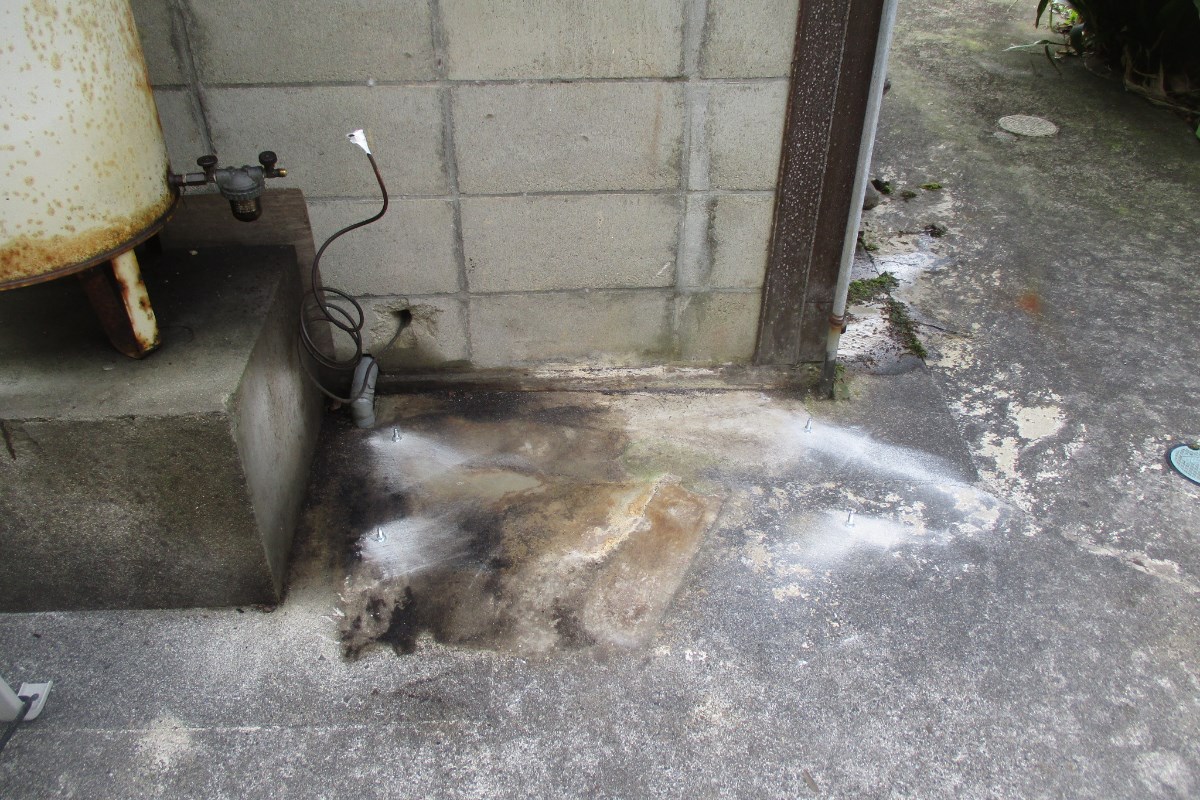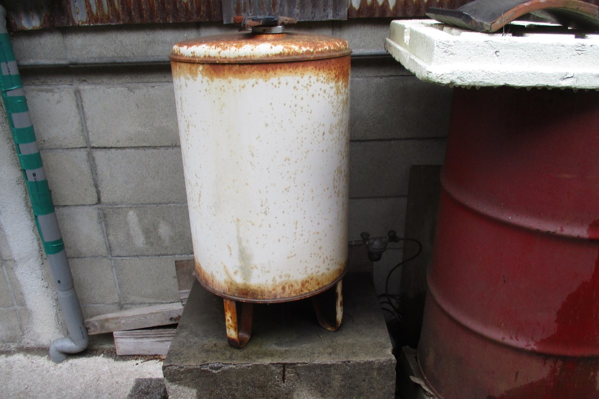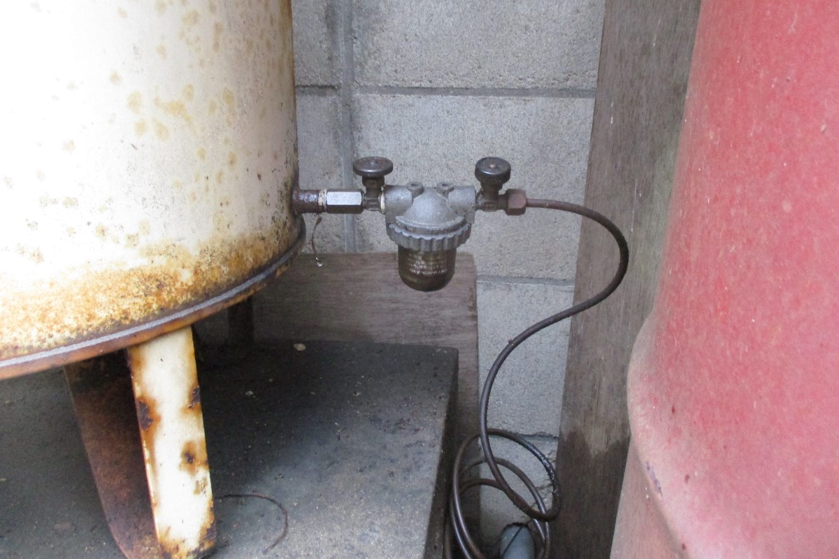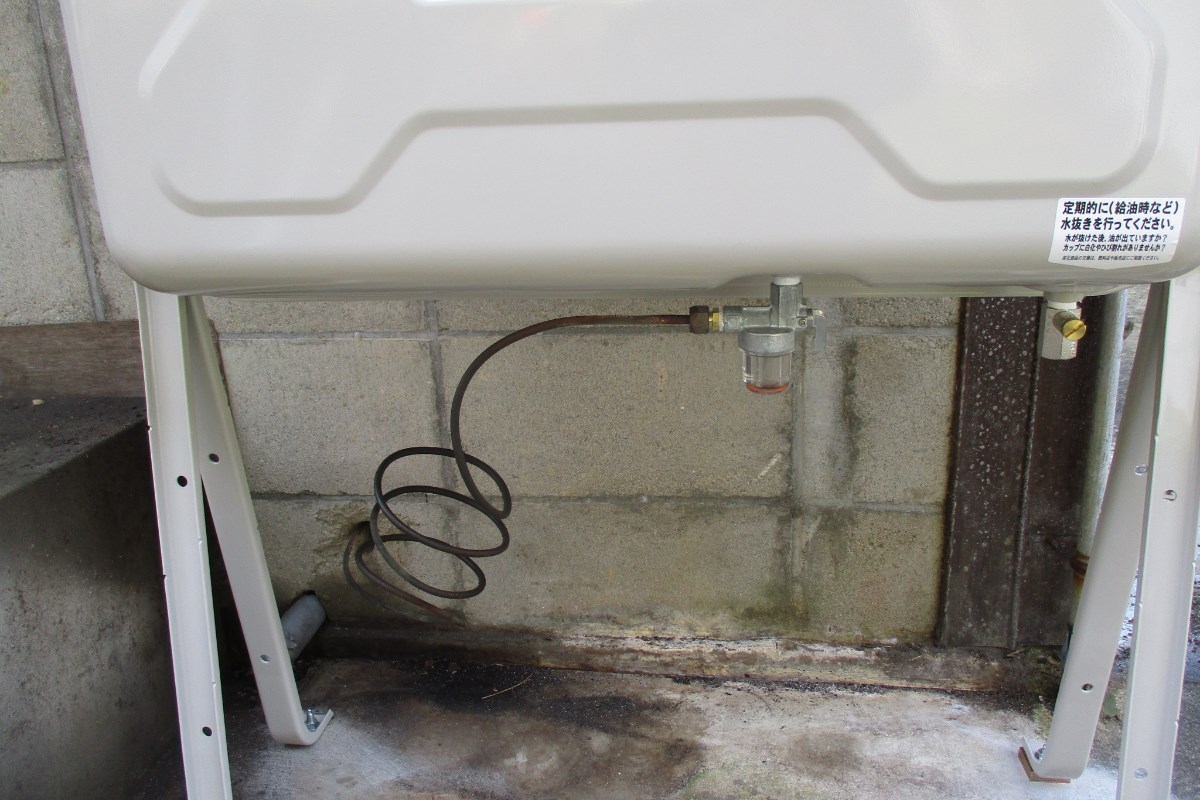 フィルターからの灯油漏れで、タンクも錆びているので取替を進めました。横のドラム缶は使用していない為、違う場所に移動し、空いた所に新しくオイルタンクを設置いたしました。