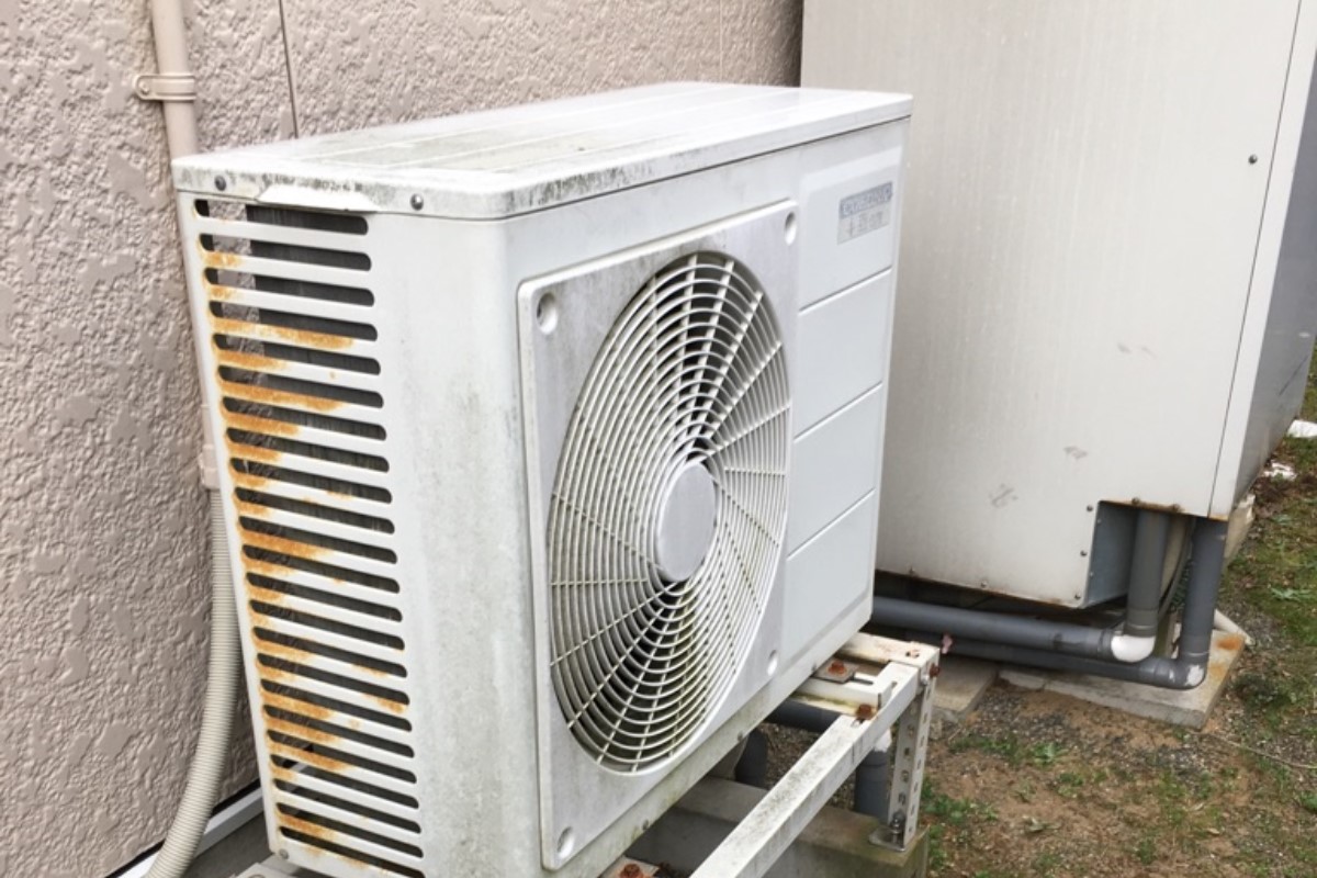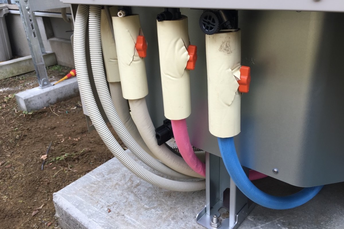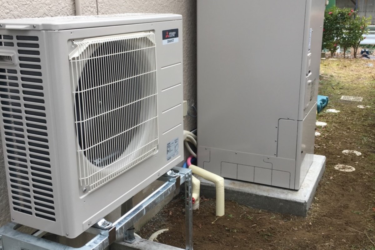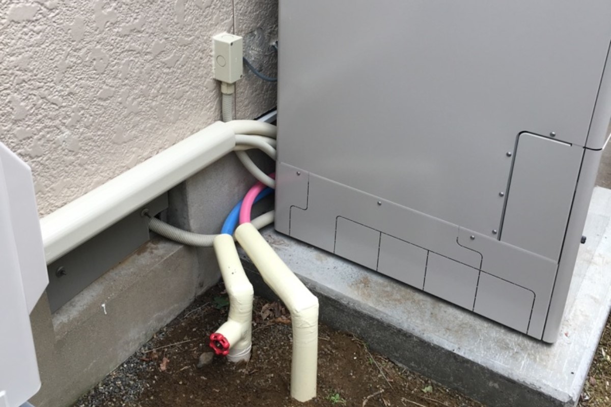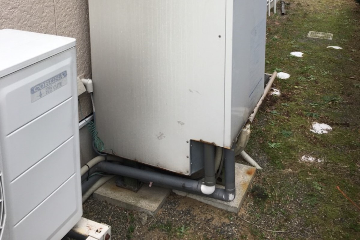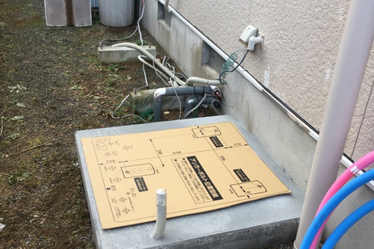 10年使用したエコキュートが壊れたとの事でご依頼あり。既存のエコキュートの土台がコンクリート板に乗せるという非常に危険な施工だったため土間コンクリートで基礎工事を行い施工。