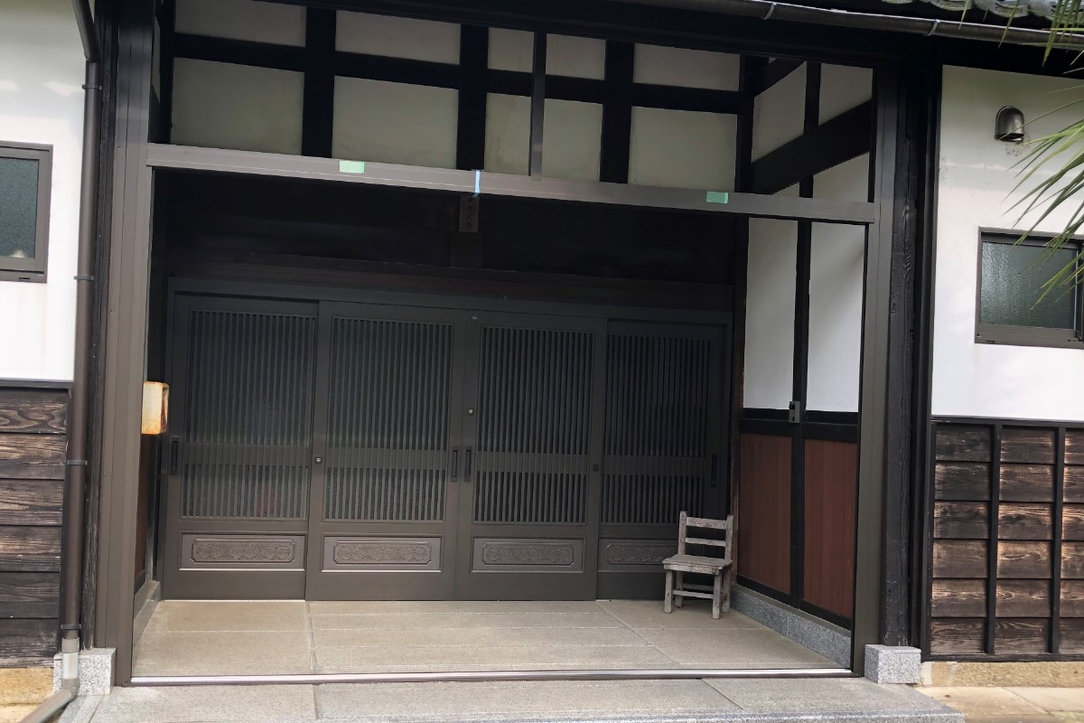 お客様より、昨年の台風の時に玄関に雨がひどく吹き込んだので、玄関の風除室を設置されたいとご要望がありました。欄間の上の部分が掃除が手が届かないとの事で、摺り硝子をご希望されましたが、摺り硝子だと硝子の強度が弱まってしまうため、今回は摺り硝子調のフィルムを貼って施工しました。