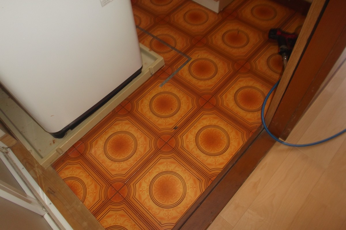 脱衣室床クッションフロア張替え工事のご依頼です。既存床材は古い建材なのでくたびれていましたので、合板を2重張り工事してから、クッションフロアを張りました。低価格でイメージが変わりますのでお手頃価格だと思います。工事依頼誠にありがとうございました。