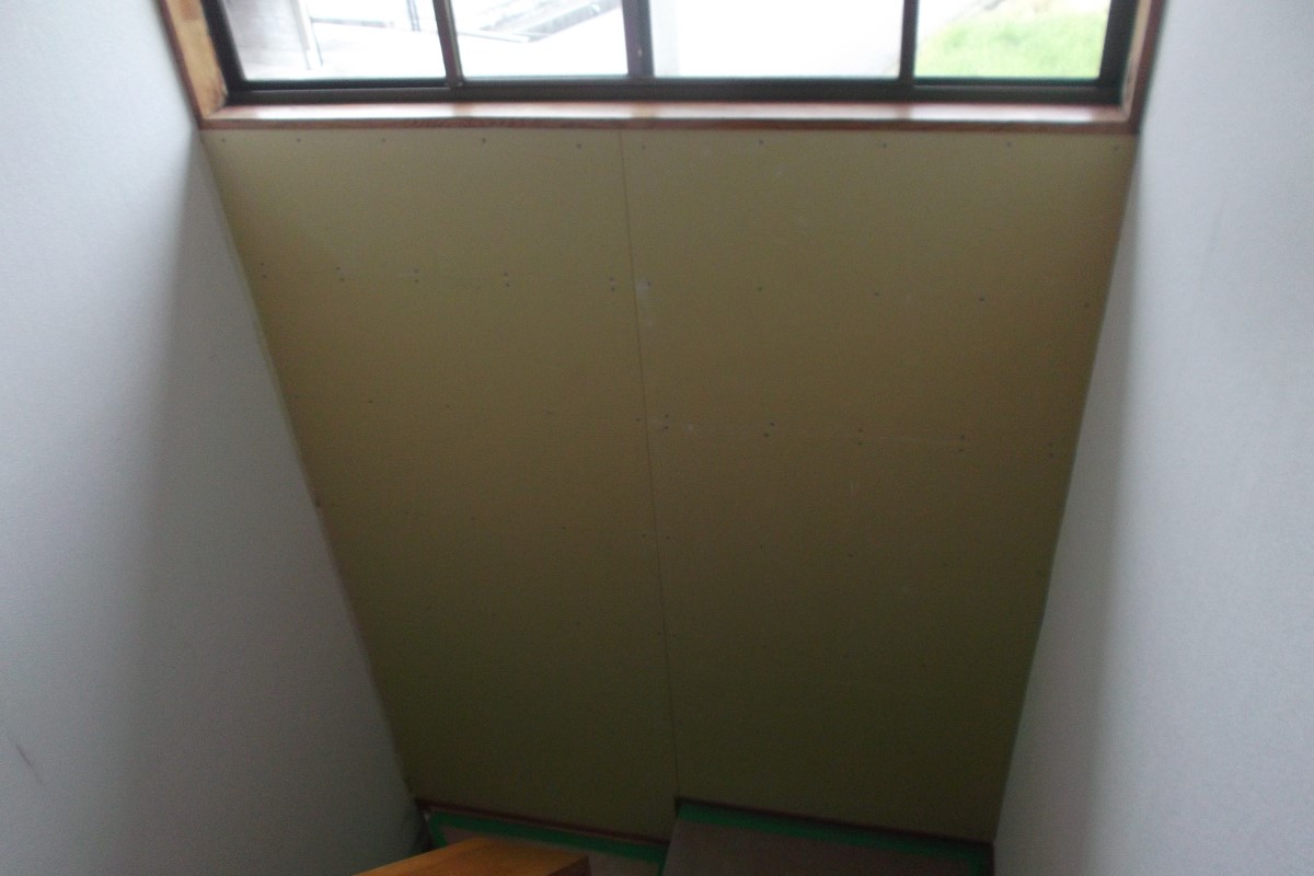 既存内装壁はがし、断熱材、プラスターボード張り工事、クロス張替え工事。