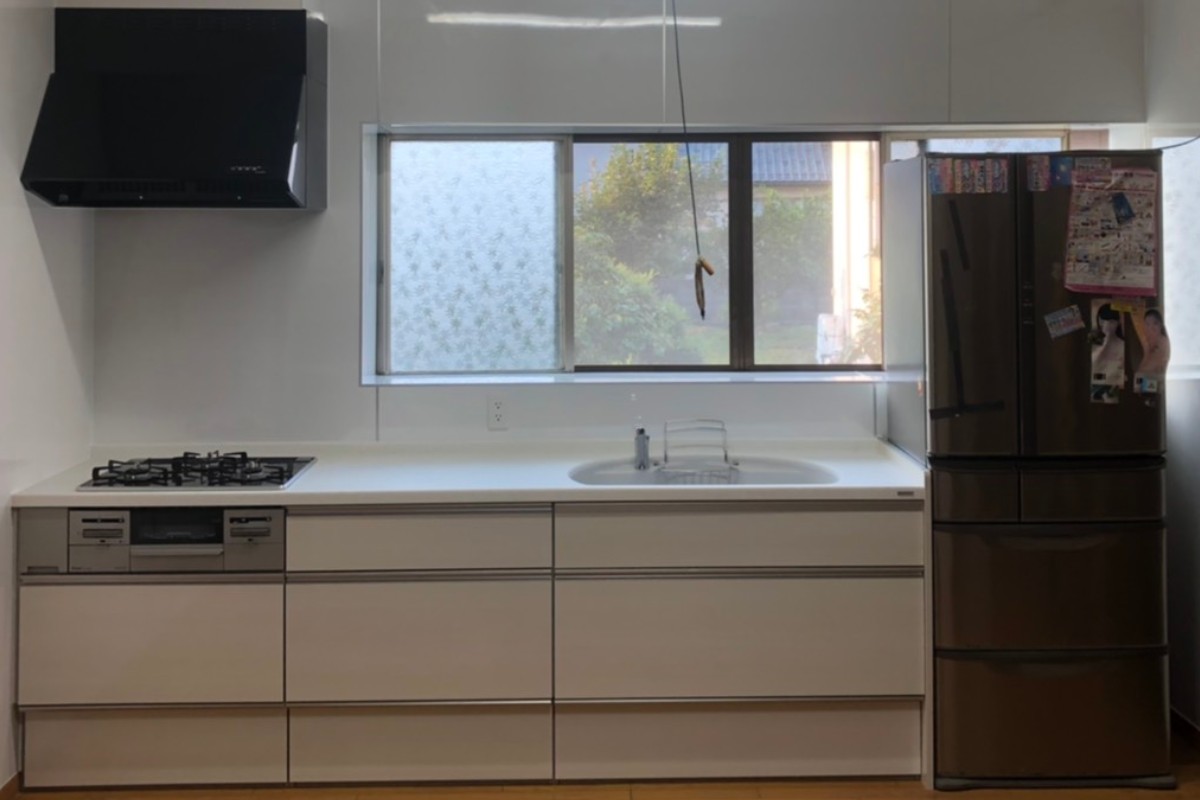 吊戸棚を外し、壁面にキッチンパネルを貼ったので、キッチンがとても明るくなったと喜んでいただけました。引き出し収納なのでお鍋などが片付いてすっきりしました。