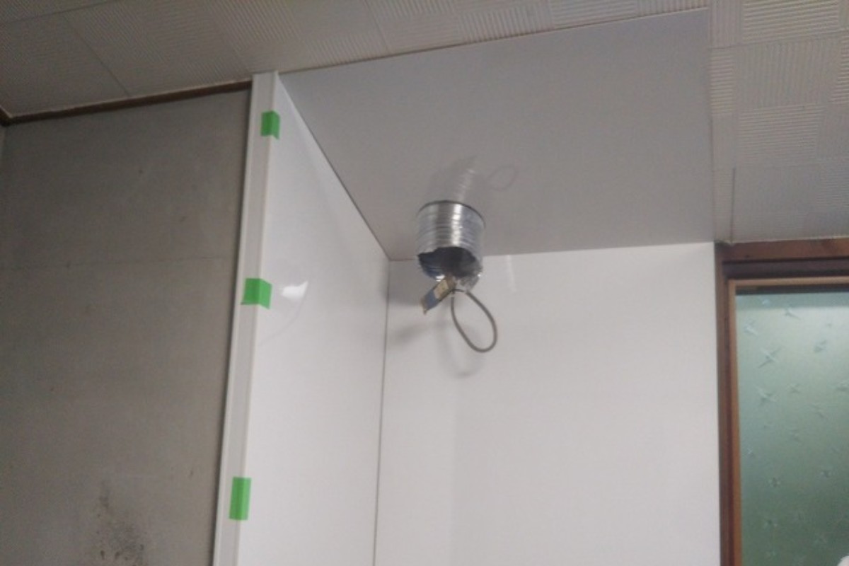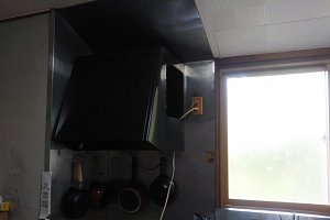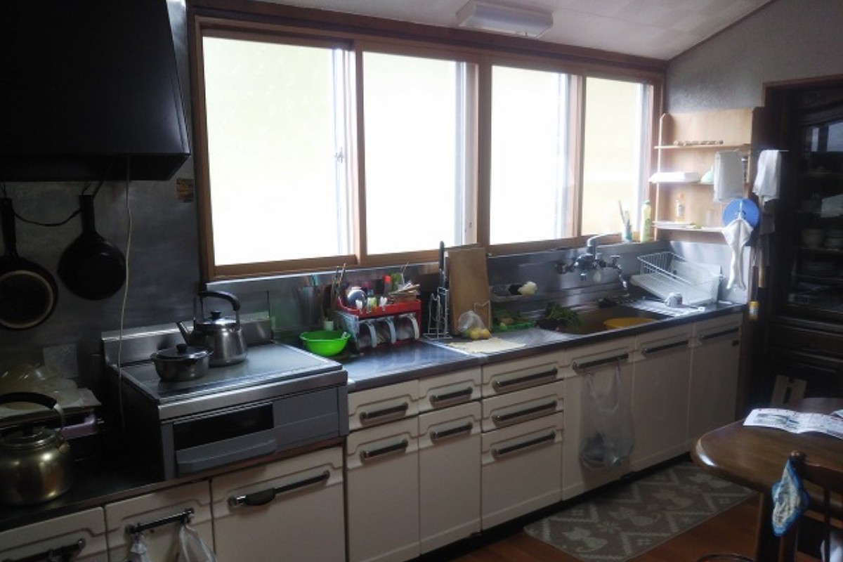 間口が広く横移動が大変だった事、換気扇がプロペラファンで吸い込みが弱いと悩んでおられました。システムキッチンを設置し空いたスペースに冷蔵庫を置くことで台所も広く使えるようになりました。換気扇はシロッコファンの設置が難しかった為、平型レンジフードを設置しました。