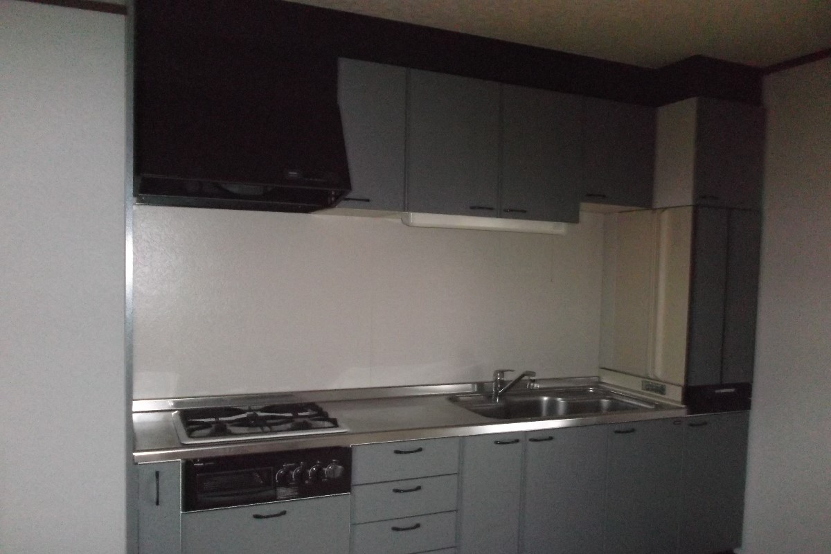 中古住宅購入後、水回りを新しくしたいと依頼ありました。既存キッチンが2700ほどありましたので、クリアランスも余裕があり、すんなり納まりました。空いたスペースは鉄骨柱風に壁を作りクロス仕上げにしました。