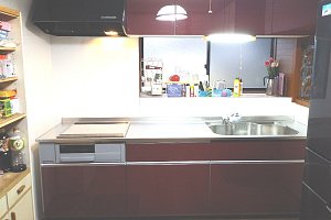 引き出しが開き戸からスライド式になったので開閉がとてもスムーズなりました。扉の色が赤色になったので前よりとても明るくなったと言って頂けました。また現場調査の時に天井に穴が開いていましたので張替えを提案して張替えをさせていただきました。
