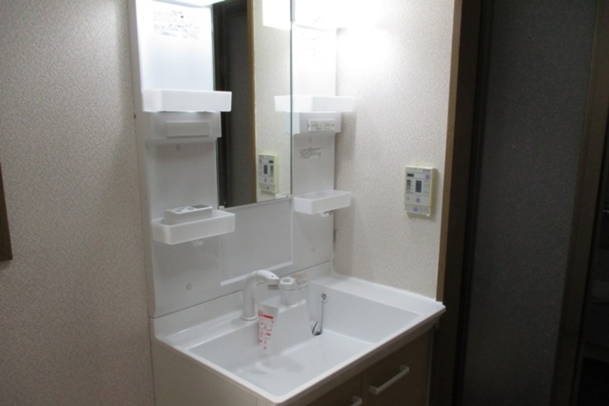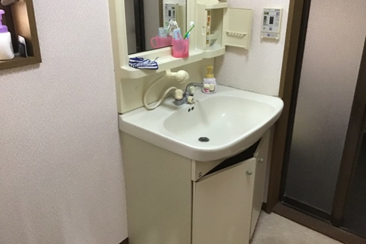 洗面化粧台のキャビネット部に水漏れがあり板に腐食が見られることで取替依頼となりました。取替前の洗面ボウルは少し大きすぎてお風呂に入る際、邪魔だったそうです。新しく取替した洗面化粧台は洗面ボウルの出っ張りがなくすっきりした感じで喜んで頂けました。