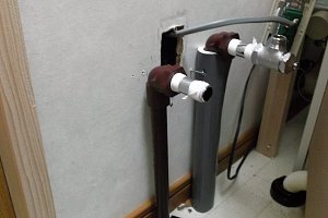 工事をしている過程で手摺取り付け工事追加致しました。洗面化粧台にお湯が元々水道工事されて無かったので、湯給水管追加工事させて頂きました。