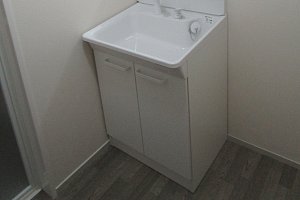 お客様のお引越し先の洗面台等水回りの老朽化等の為、お引越しに合わせてユニットバス、キッチン、トイレ、洗面台等のリフレッシュをお考えとのお話を頂きまして、今回のリフォームを当社でご選択いただきました。その洗面台編です。一緒にお風呂もリフォームして頂いておりますので、脱衣所内もキレイにリフレッシュしました。