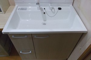 既存の洗面化粧台が脱衣室にあるのですが、以前、何処かの工務店にてリフォームした際に1本引きのドアを付けたのですが、ドア幅が狭く、古い洗面化粧台を取替たくても部屋から出せないので困っていたそうです。開発店にご来店され相談して来られました。既存洗面化粧台のボール部分をハンマーにてたたき割り部屋から無事に出しました。(勿論ちゃんと養生しました。)その後、扉内寸サイズで納まる洗面化粧台を選択して取付しました。W様ご成約ありがとうございました。