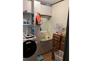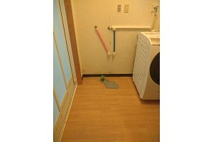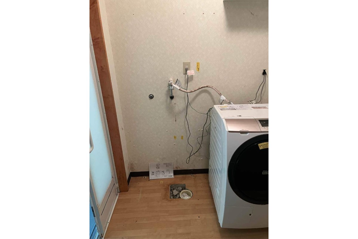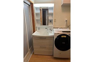既存の洗面化粧台を撤去し、設置場所を変えるため電気・水道をやり直し、新しい商品を設置