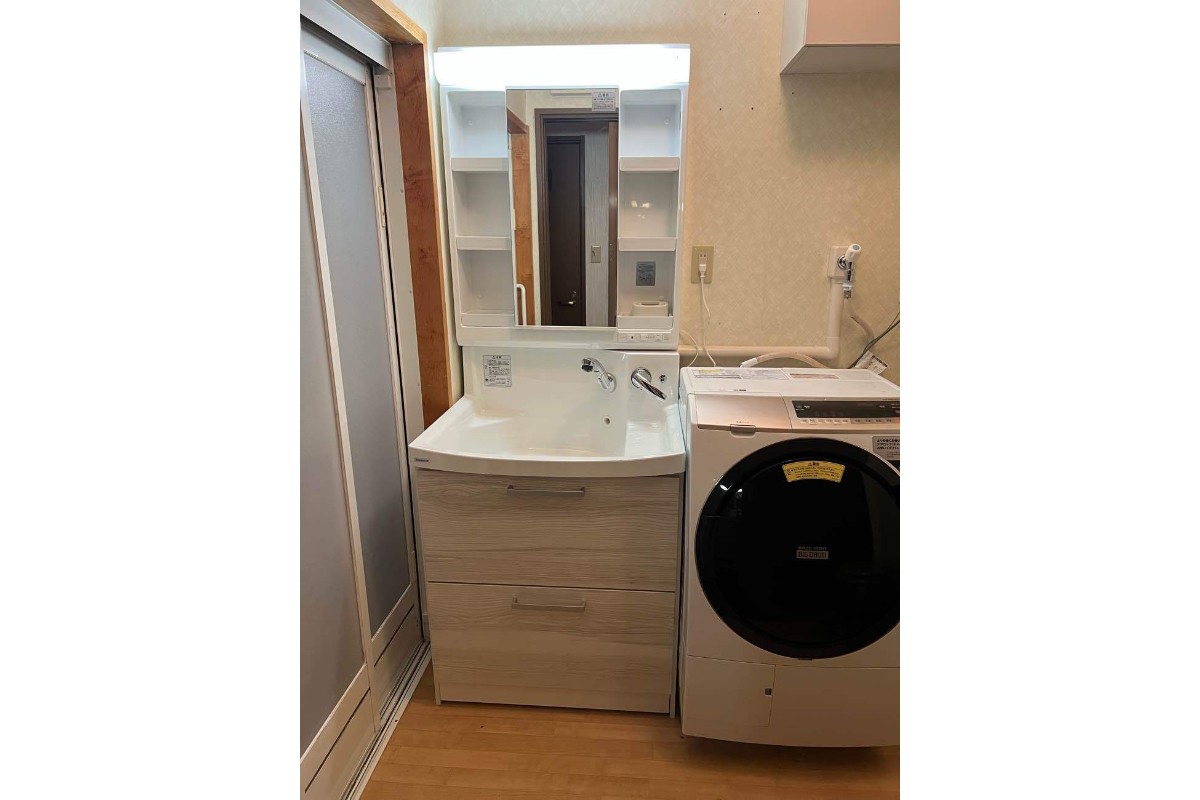 既存の洗面化粧台とその周辺部を撤去し、その後、設置場所をかえるため電気と水道工事をしてから新しく設置しました。シンプルですっきりしたものになり、使いやすく配置もかえました。