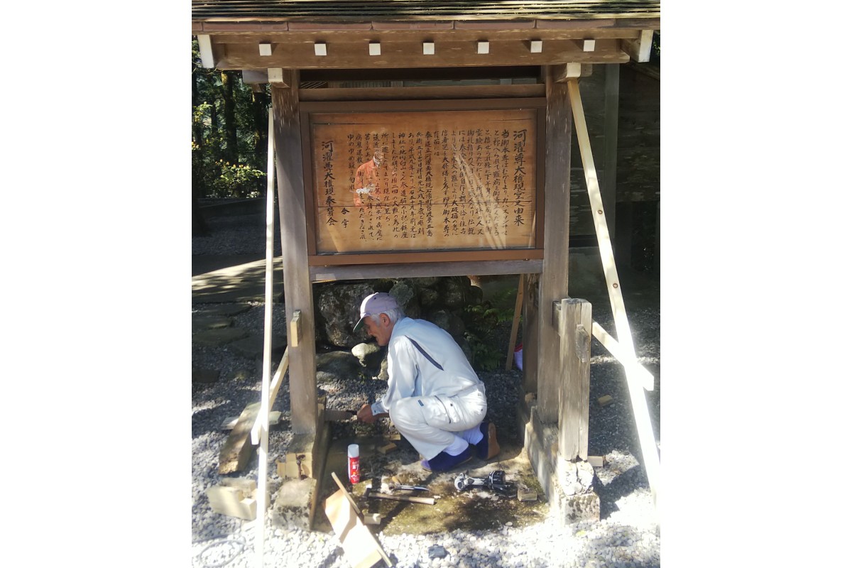 河濯尊大権現堂【カワスソンダイゴンゲンドウ】という200年以上前に建てられた、由緒正しい祠の由来が書かれた看板の補修です。