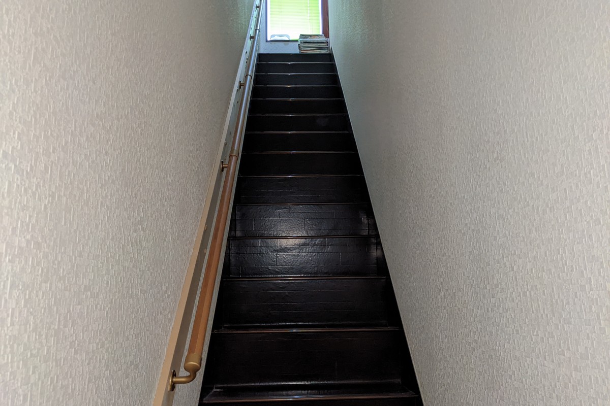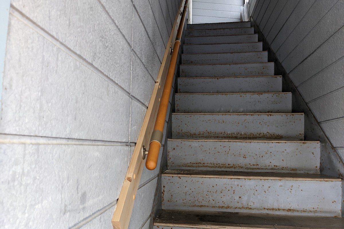鉄骨作りの建物で階段の段数が在来木造建築よりも多く、壁内の下地も不規則に配置されており、手摺ブラケット用の下地の取付にも苦労しましたが、室内、室外とも強固に固定が出来ました。これから安心して昇降して頂けると思います。