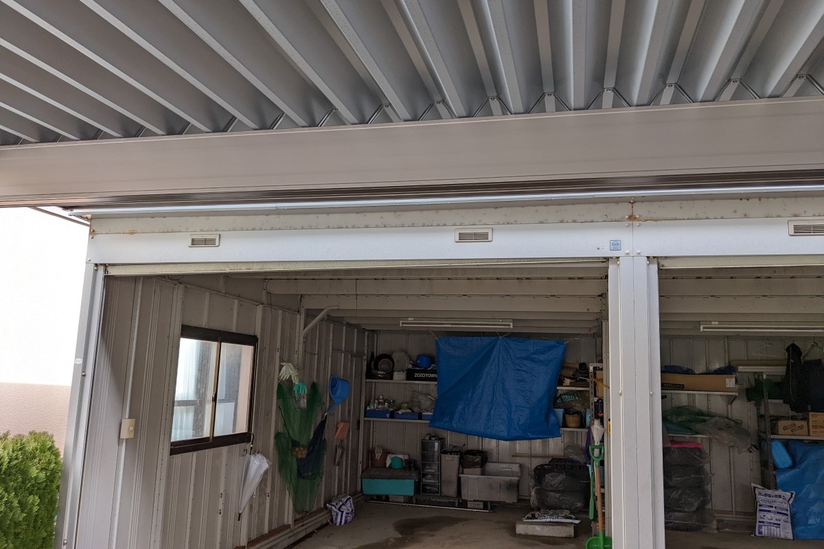 約20年前に組み立てられたイナバ物置製のガレーシャッターのシャッターが斜めに降りてきてしまい、開閉が出来ないとのご連絡があり2~3日だけ待って頂きイナバ物置の代理店に連絡を入れたところイナバ物置の方では修理が出来なかった為シャッター専門の工事職人さんにお願いをし調整させて頂き昇降が可能になりました。