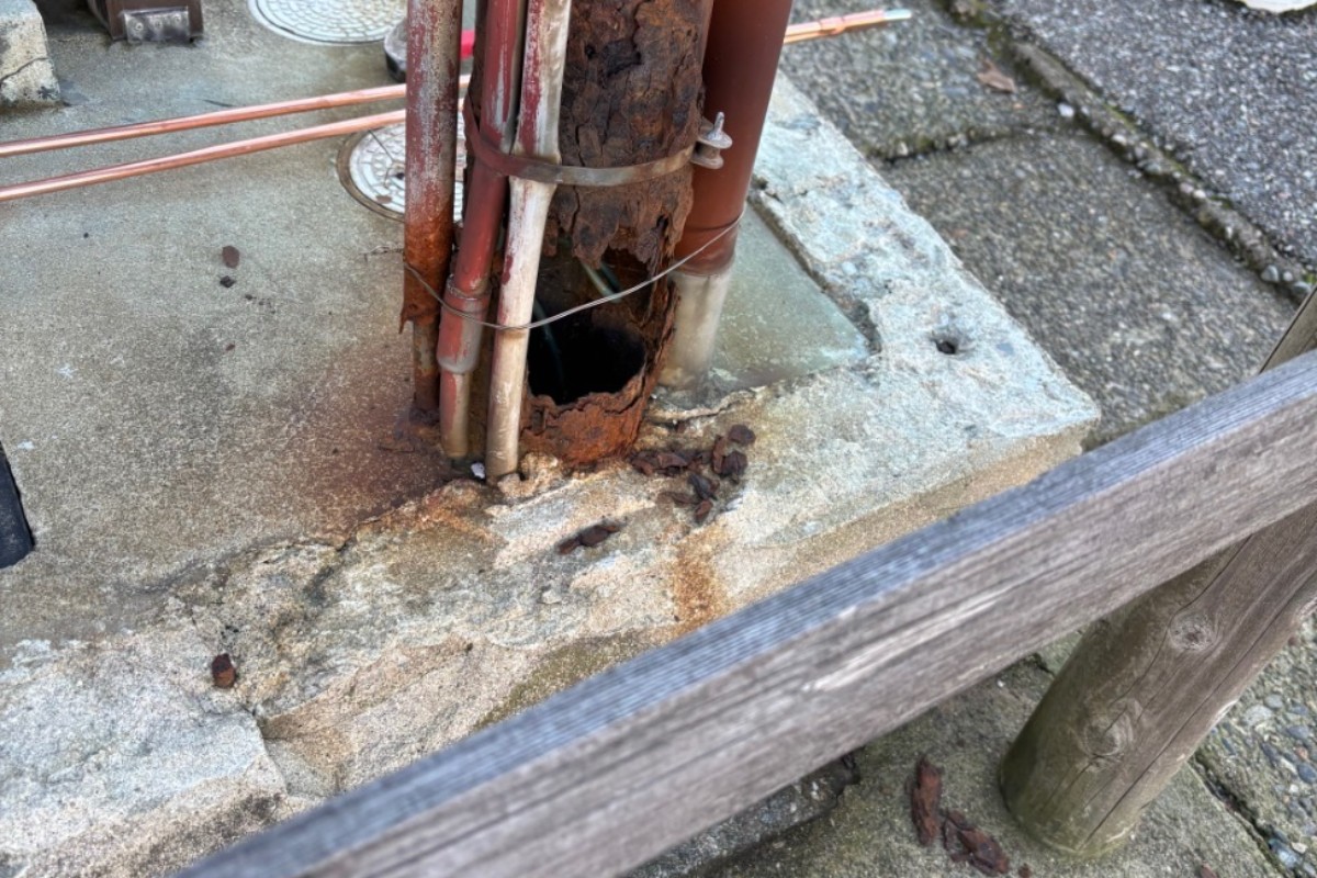 電気メーターを設置しているポールが錆てしまい、いつ倒れるか分からない状態に