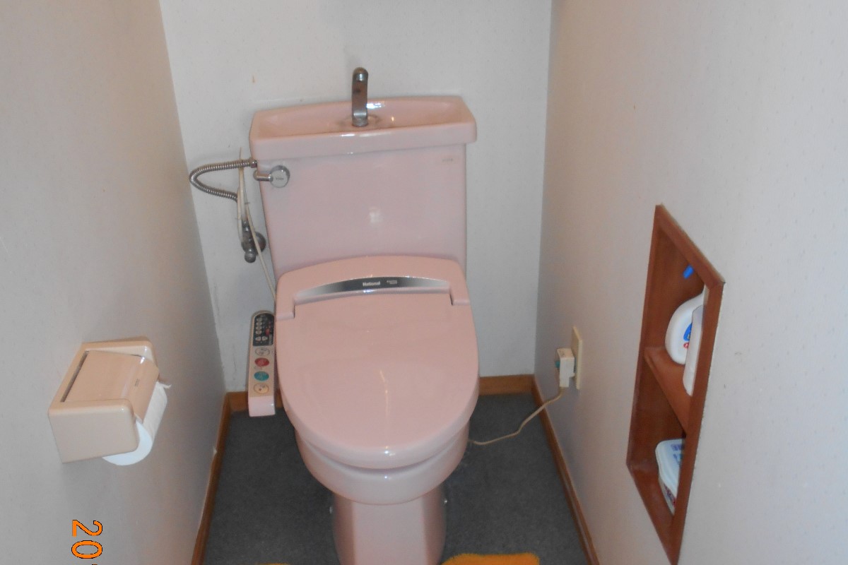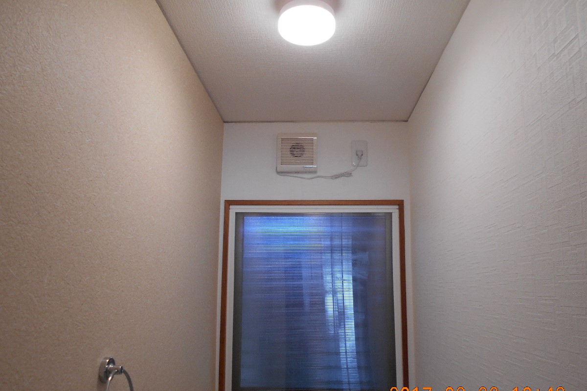 5年前よりトイレが壊れていた、2階にもあるためあまり困ってはいなかったが、自身も年をとりいちいち2階へ上がるのもつらい為、思い切って改装となりました。床の段差がありフロアでバリアフリー化したかったとのこと。また将来に備えて手すりを付けられるよう壁にボードではなくコンパネ下地をしてはどうかと提案。クロス工事用に下地コンパネで仕上げしました。クロスは器具面をアクセントに色目を変更、おしゃれに仕上がっています。天井照明も将来に備えLED照明に交換、パイプファンも同時に交換しています。