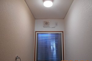- 1Fトイレリフォーム コンパネ下地クロス貼り 手洗いカウンター 床段差解消 天井LED照明