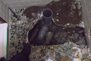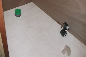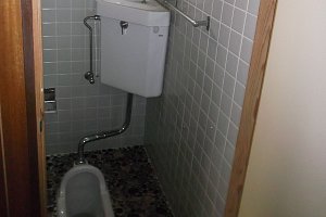 既存トイレ・大小便器解体間仕切壁撤去工事・壁/床下地(大工工事)クロス張り工事・クッションフロア張り工事・アラウーノV手洗い付取付工事。