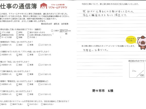 毎日必ず使う場所ですので、工事手配などすぐ行い受付の2日後に工事完了しました。