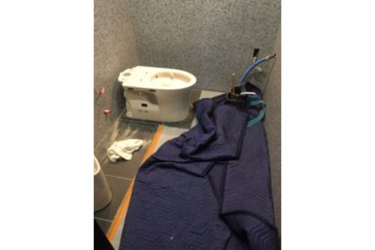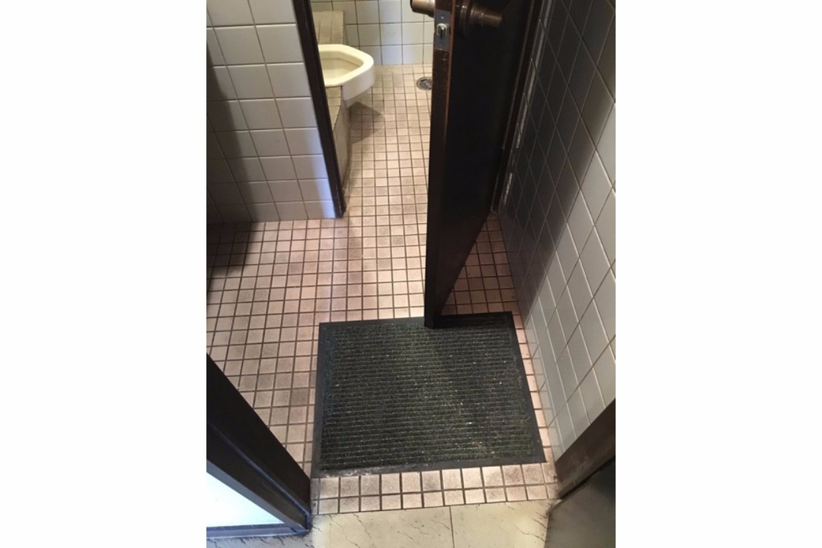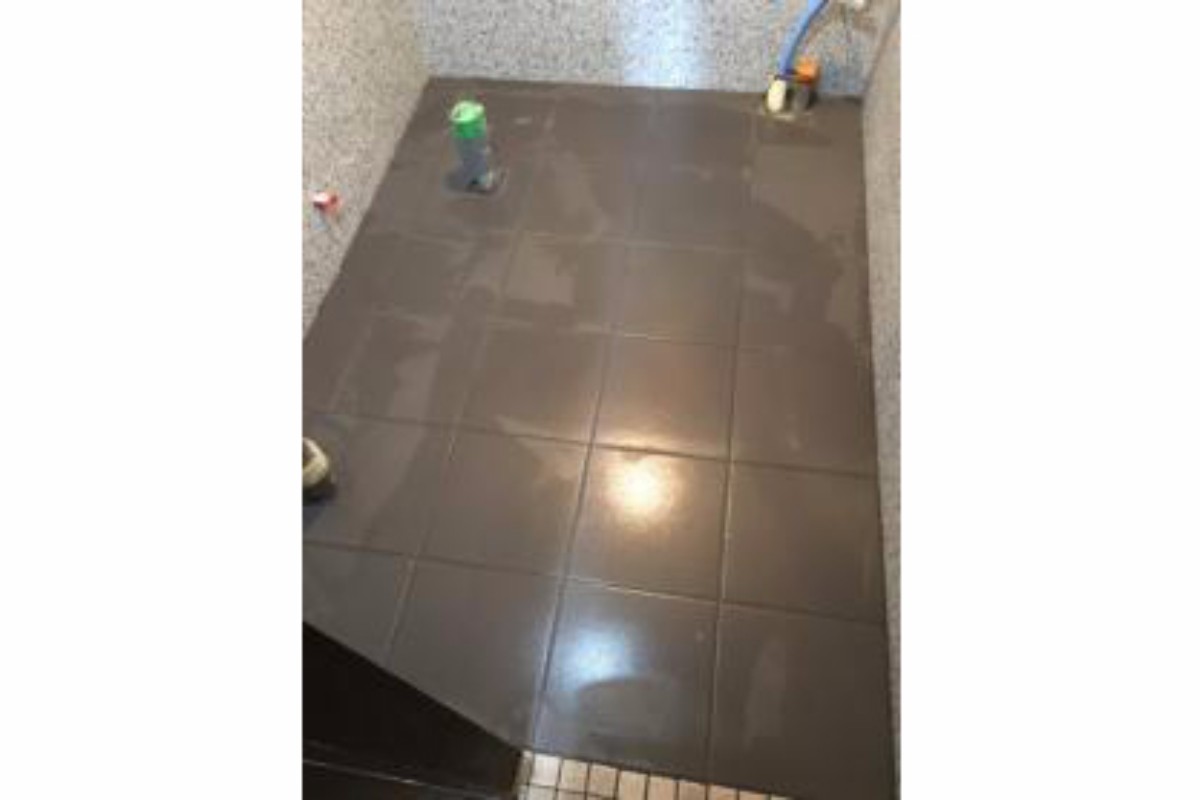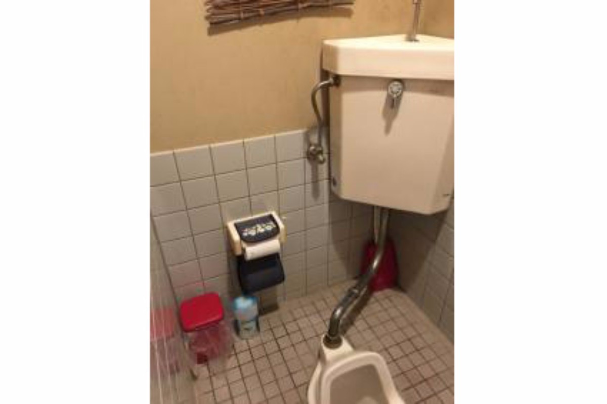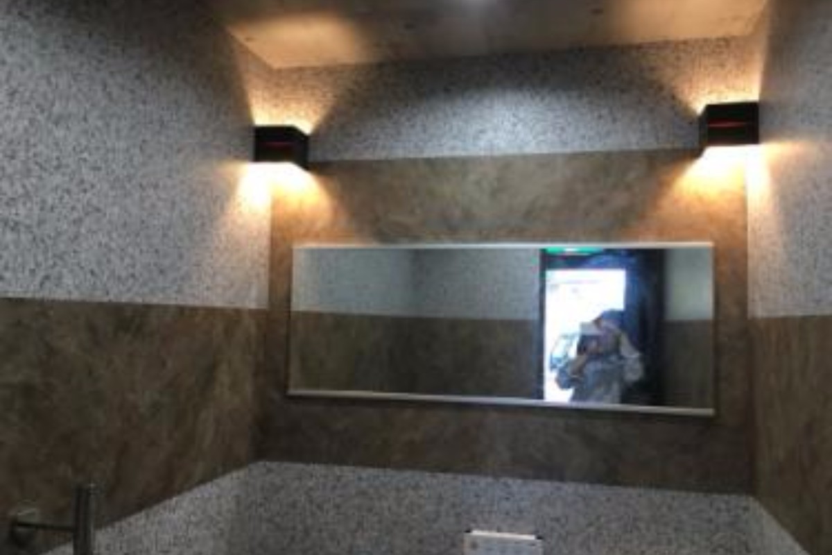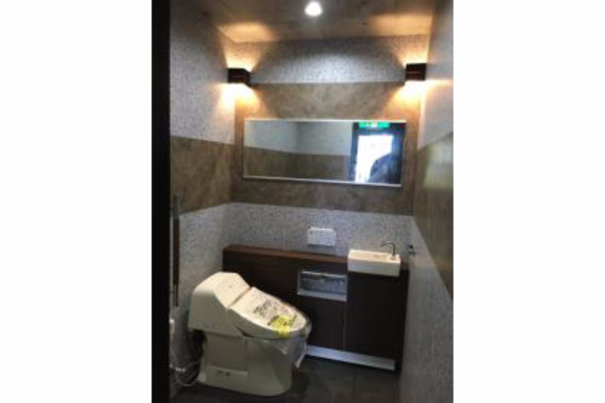 和式トイレの間仕切りを取り払い、広い空間にリフォームしました。おしゃれな感じにしたいとの要望でコーナーLED照明と壁一面に鏡の取付け。ご主人のこだわりで壁のフロアタイルでラインを入れました。お客様にも好評との事でうれしいかぎりです。